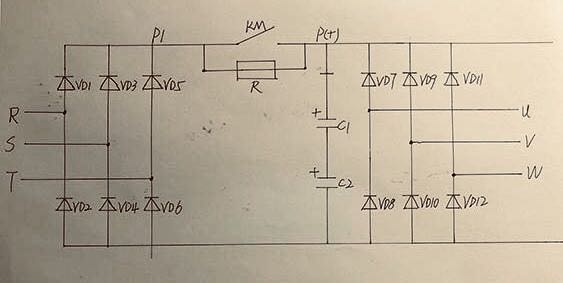 VD1~VD6為輸入三相整流電路,R為充電電阻,KM為充電接觸器。C1、C2為串聯(lián)儲(chǔ)能電容。VD7~VD12為三相逆變電路中6只二極管。IGBT除非在漏電和短路狀態(tài)能沒出電阻變化,對逆變輸出電路我們能實(shí)際測出的只是6只二極管的正、反電阻值。這樣一來,整個(gè)驅(qū)動(dòng)器主電路的輸入整流和輸出逆變電路,相當(dāng)于兩個(gè)三相橋式整流電路。