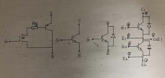 以上說到對端子電阻的測量只是大致判定IGBT的好壞,尚不能最后認(rèn)定IGBT就是好的,簡易測量后,就對客戶說,輸出模塊是好的,會(huì)給自己帶來極大的被動(dòng),IGBT的好壞還需進(jìn)一步測量驗(yàn)證。如何檢測IGBT的好壞,得首先從IGBT的結(jié)構(gòu)原理入手,找到相應(yīng)有效的測量方法,如圖所以為IGBT等效電路和單、雙管模塊引腳圖。