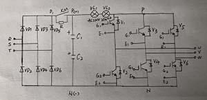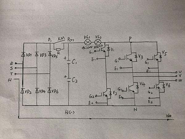 1)放大器在停機狀態(tài),燈泡亮。3只一只上,下臂IGBT漏電,如V1和V2。此種漏電在低電壓情況下不易暴露,如萬用表不能測出,但引入直流高壓后,出現(xiàn)了較大的漏電,說明模塊內(nèi)部有嚴重的絕緣缺陷。購買的拆機品中的模塊有時候出現(xiàn)這種情況,可用排除法檢修,如拆除U模塊(V1、V2)燈泡不亮了,說明該模塊已損壞。